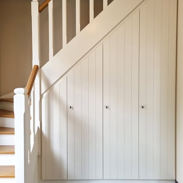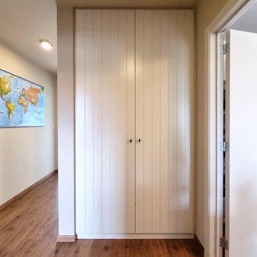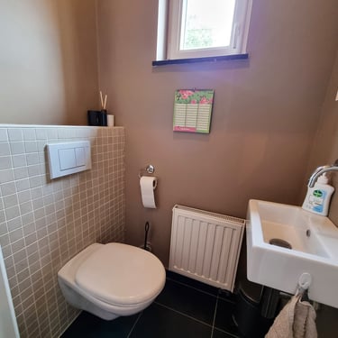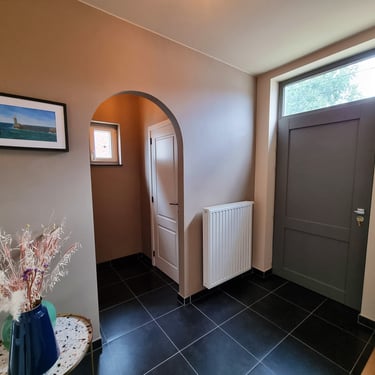 Via de houten voordeur komen we binnen in de ruime inkomhal, uitgerust met (diepe) maatkasten en geeft ons toegang (via dubbele deur) richting leefruimte. Verder beschikt de inkomhal over een apart gastentoilet (met eigen radiator en wastafel) en hierdoor heel wat bergruimte.