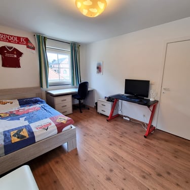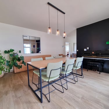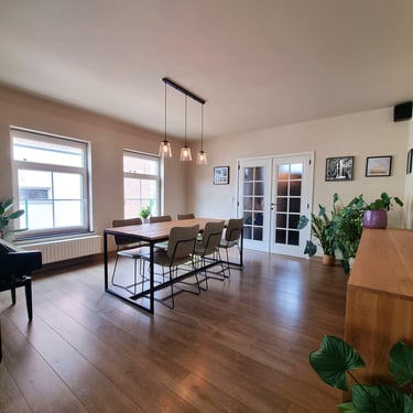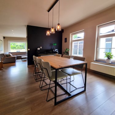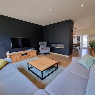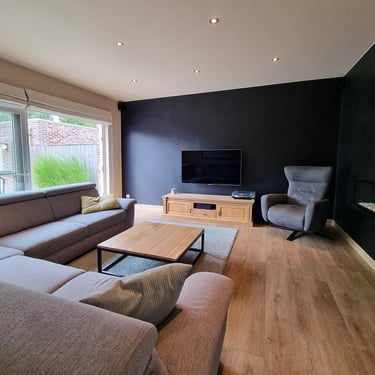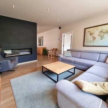 Een grote open woonkamer maar heeft toch voldoende mogelijkheden om ‘persoonlijke ruimte’ te creëren. De ingewerkte cassette (Bodart & Gonay) op gas deelt de ruimte perfect op in eetplaats en gezellige zithoek/zetelhoek. Bijzonderheden: geïntegreerd surround system, dimbare spots, vlies op plafond en videofoon Btcino via wifi & smartphone applicatie.