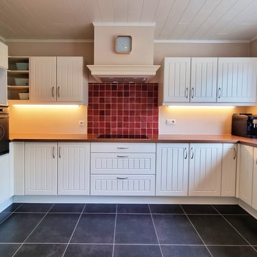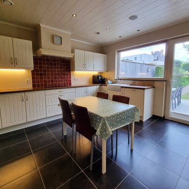 De ruime keuken, met direct toegang tot de tuin, biedt plaats voor een (grote) eettafel. Keuken zelf heeft heel wat bergruimte en een ruim werkblad. Technisch voorzien van ingebouwde koelkast, oven, fornuis, dampkap en nieuwe vaatwasser Miele 2024.
