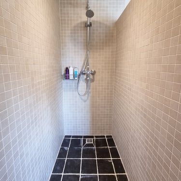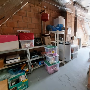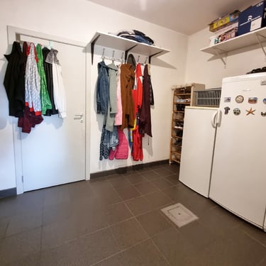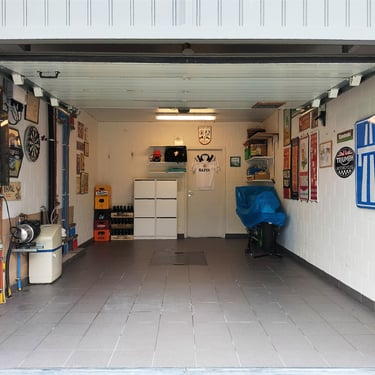 Grenzend aan de keuken vinden we de berging met heel wat kast- en (opberg) ruimte + aansluitingen was- en droogkast. De garage, steeds plaats gegeven aan 1 auto, 2 fietsen en 2 moto’s, is bereikbaar via een houten sectionale poort op elektriciteit (recent laklaag 2024). Technisch: tellers, regenwaterpomp en jaarlijks onderhouden waterverzachter.