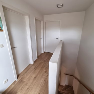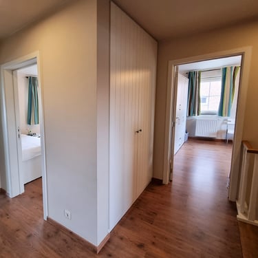 De nachthal op de eerste verdieping is voorzien van ingemaakte kasten en geeft toegang tot 3 grote slaapkamers en badkamer. De masterbedroom heeft een aansluitend ook een praktische dressing.