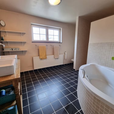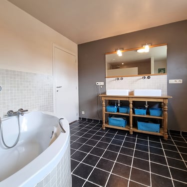 Badkamer met dubbele wastafel en grote spiegel, groot ligbad en toilet. Afzonderlijke inloopdouche met regendouche en handsproeier.